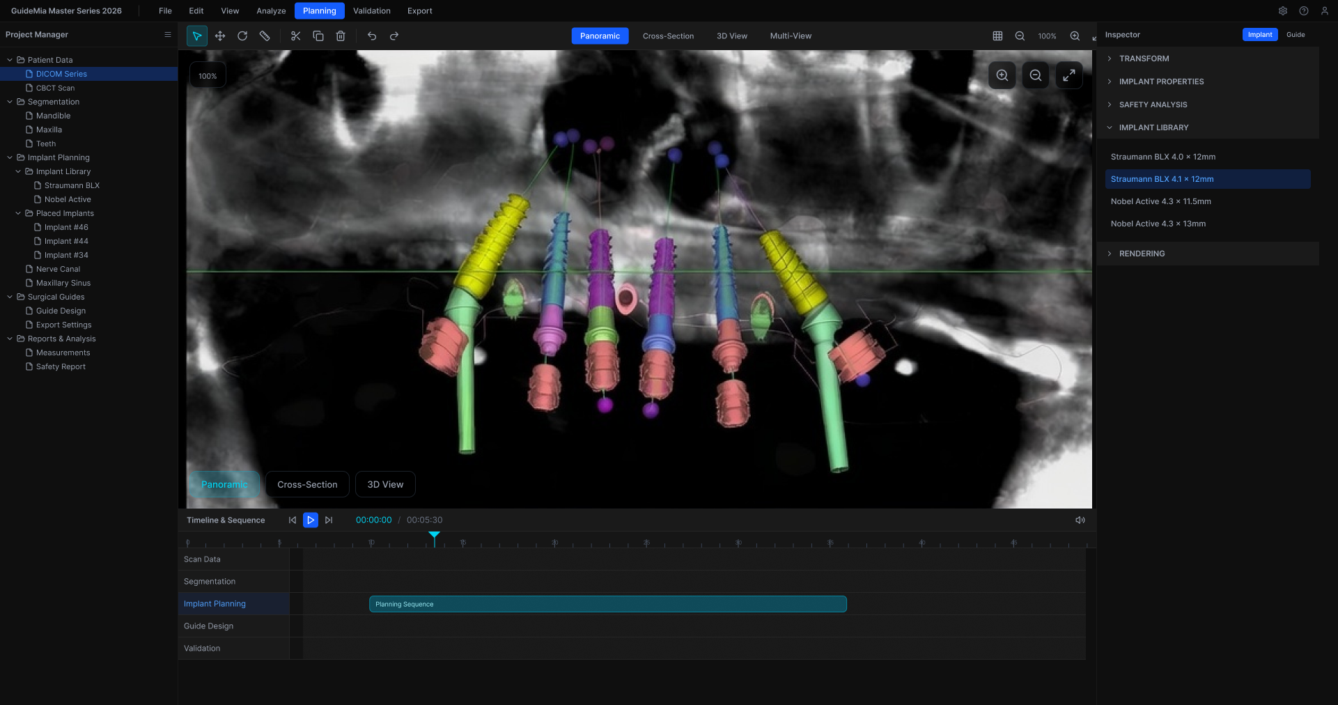 GuideMia is a dental implant planning system used for panoramic, cross-sectional, and 3D implant placement workflows. While clinically robust, the interface had evolved over time into a visually dense workspace, making it harder to scan anatomy, measurements, and controls during long planning sessions on high-resolution clinical workstations.